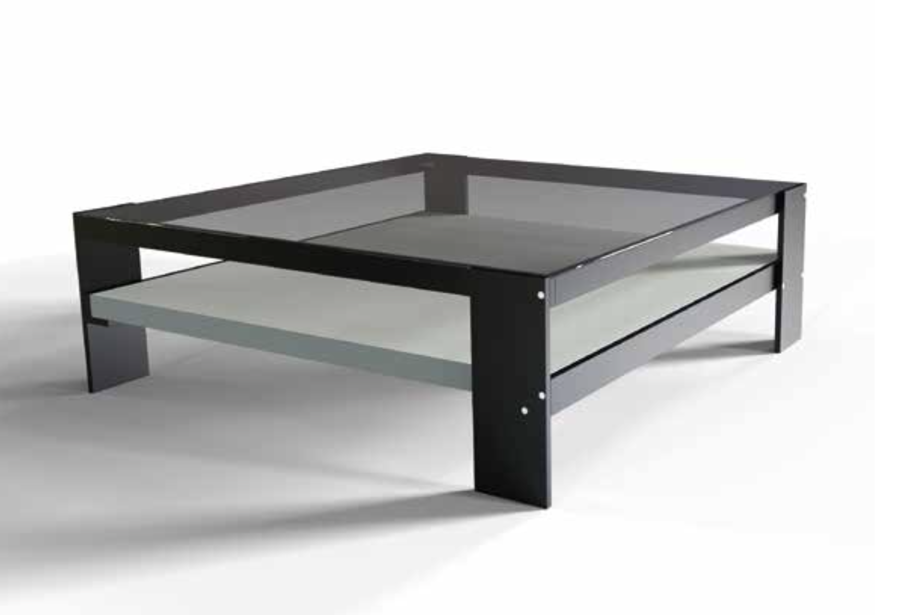 Una pieza de estética minimalista que destaca por su estructura geométrica y racional. Combina un sobre de cristal templado superior con un estante inferior de madera, creando un elegante juego de planos y contrastes cromáticos.